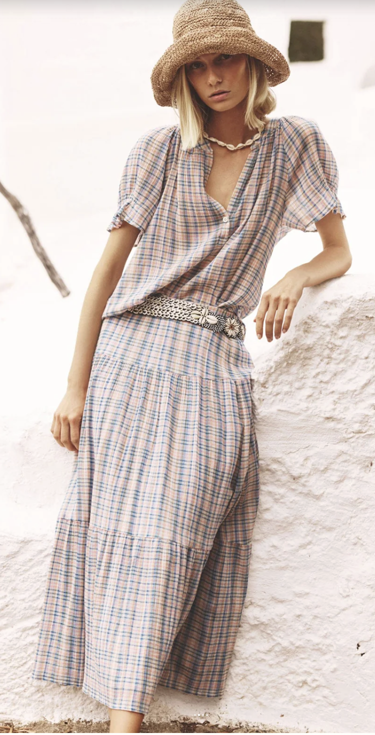 Pretty in Print. Alexia in a cotton confetti check print. This flowy tiered skirt features a flat front and elasticized back waist. Pair her back to the Astryde top for a matching set.