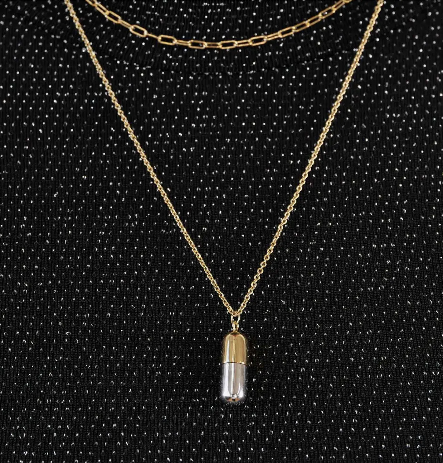 Create an account- 14k gold and sterling silver plating on brass base with lobster style clasp - Working pill capsule - unscrews to open - Includes e-coating: a strong clear barrier that protects from scratches and moisture - Nickel-free and naturally hypoallergenic - Adjustable length - can be worn from 18-21 inches