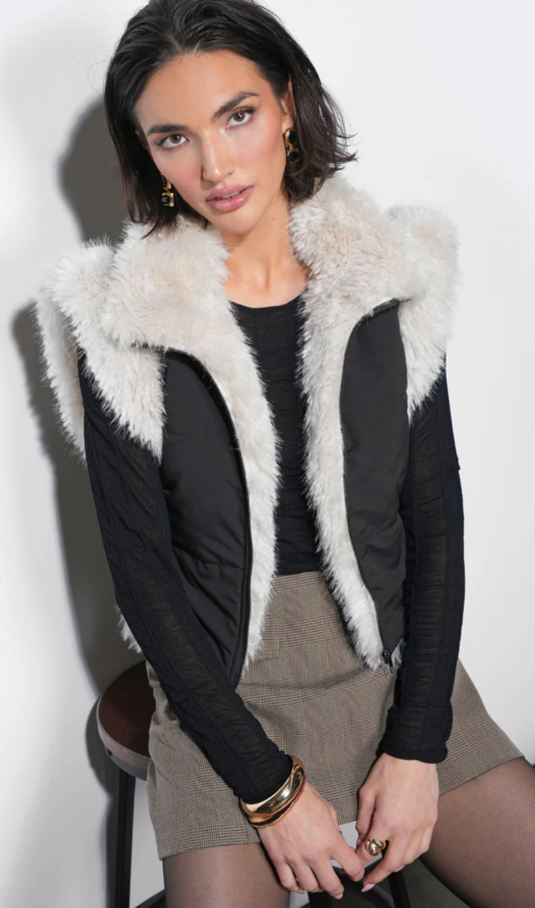 This cozy layer features plush faux fur lining for extra softness and warmth, complemented by a sleek, padded exterior that adds structure and style. Designed with a front zip closure and practical pockets, it’s both functional and fashion-forward.