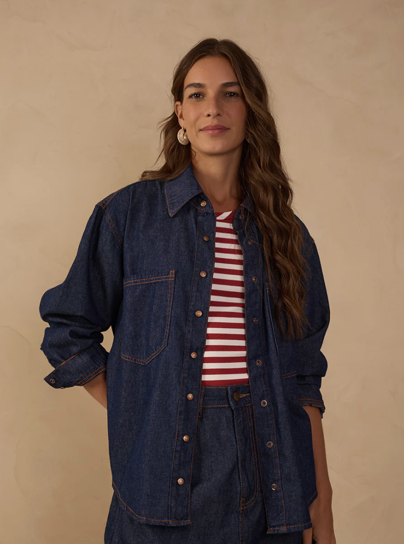 A shirt is a fundamental piece in the every closet, with dark wash, collared neckline, pockets, front button closure, dropped shoulders, fitted cuffs, and an elongated length. A timeless piece that works in every season.