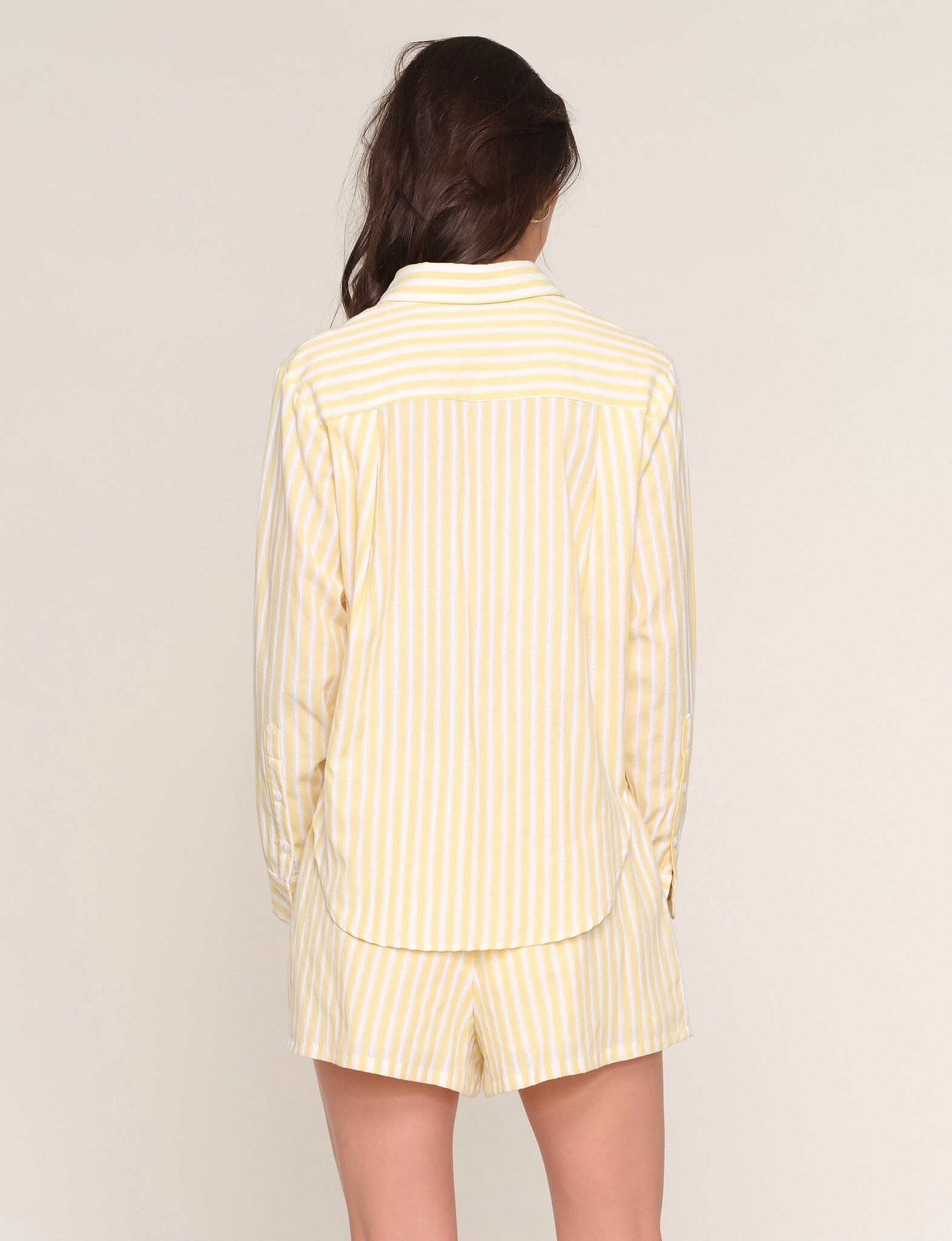 Sunny and playful, this 3-piece yellow striped set features a ruched tube top with straps, an easy button-down shirt, and relaxed boxer-style shorts. Lightweight and breezy, it’s the ultimate vacation trio — wear together or mix and match.