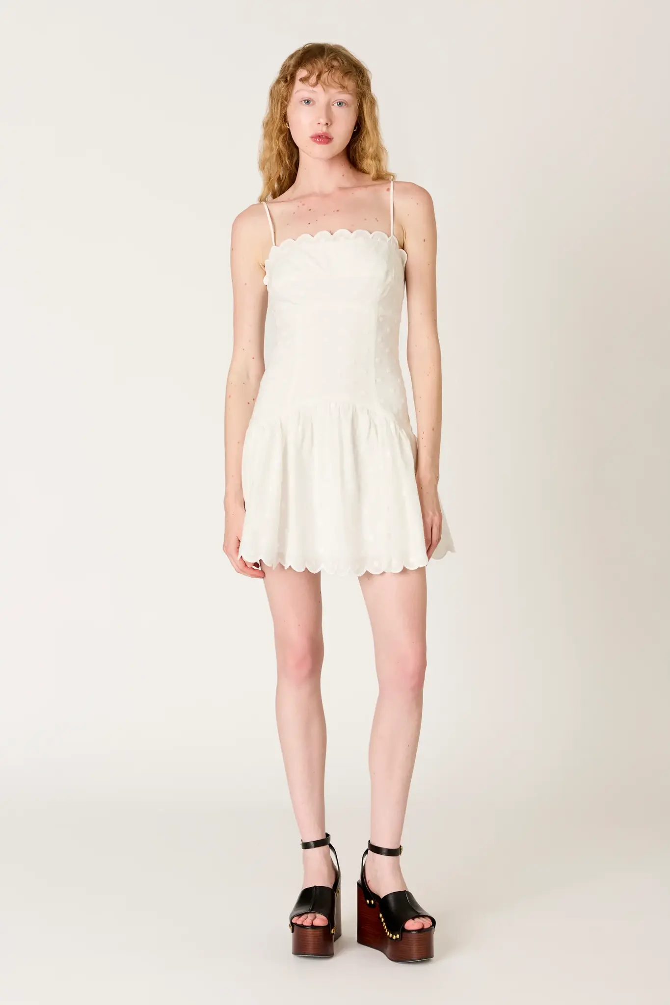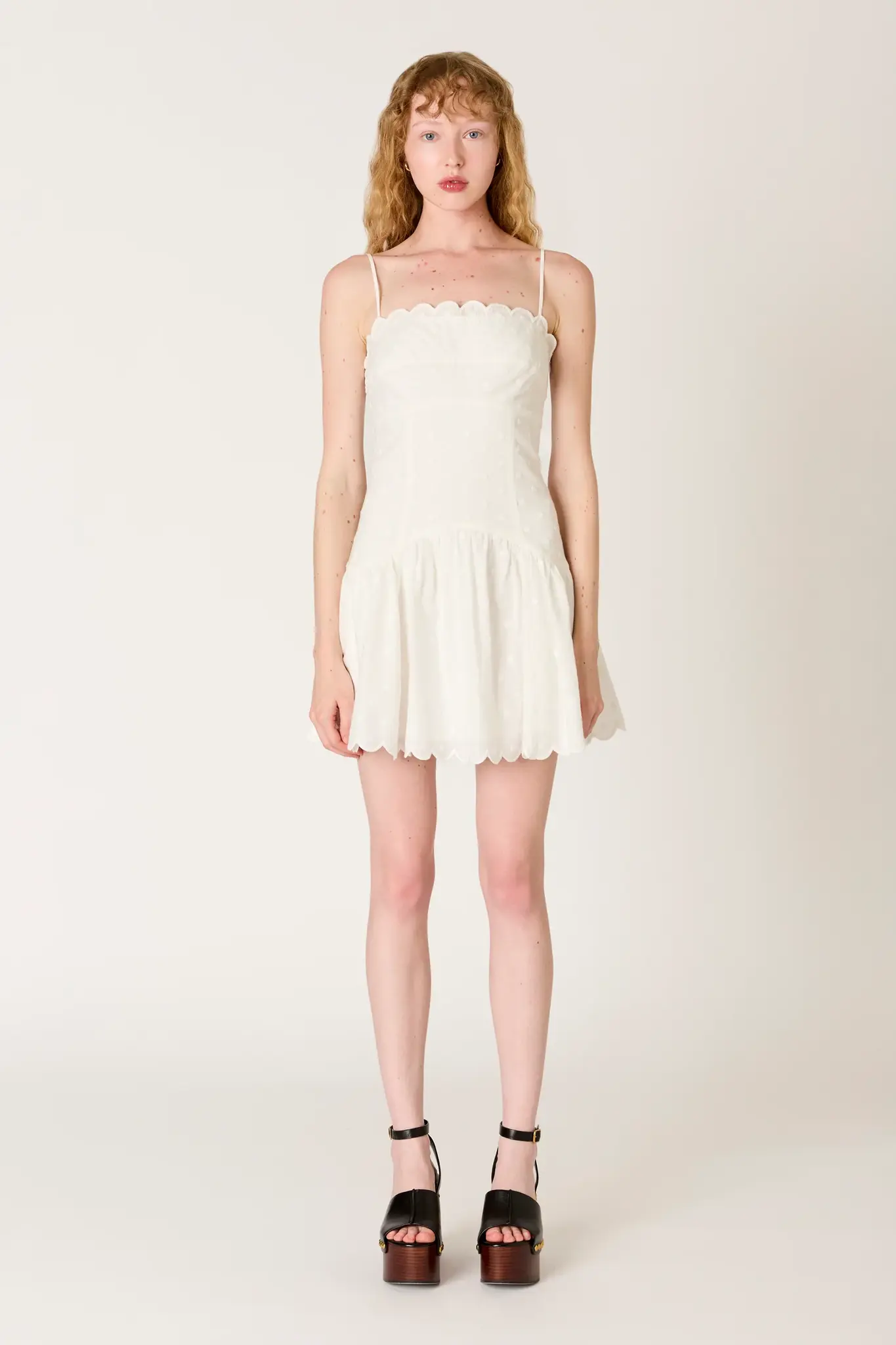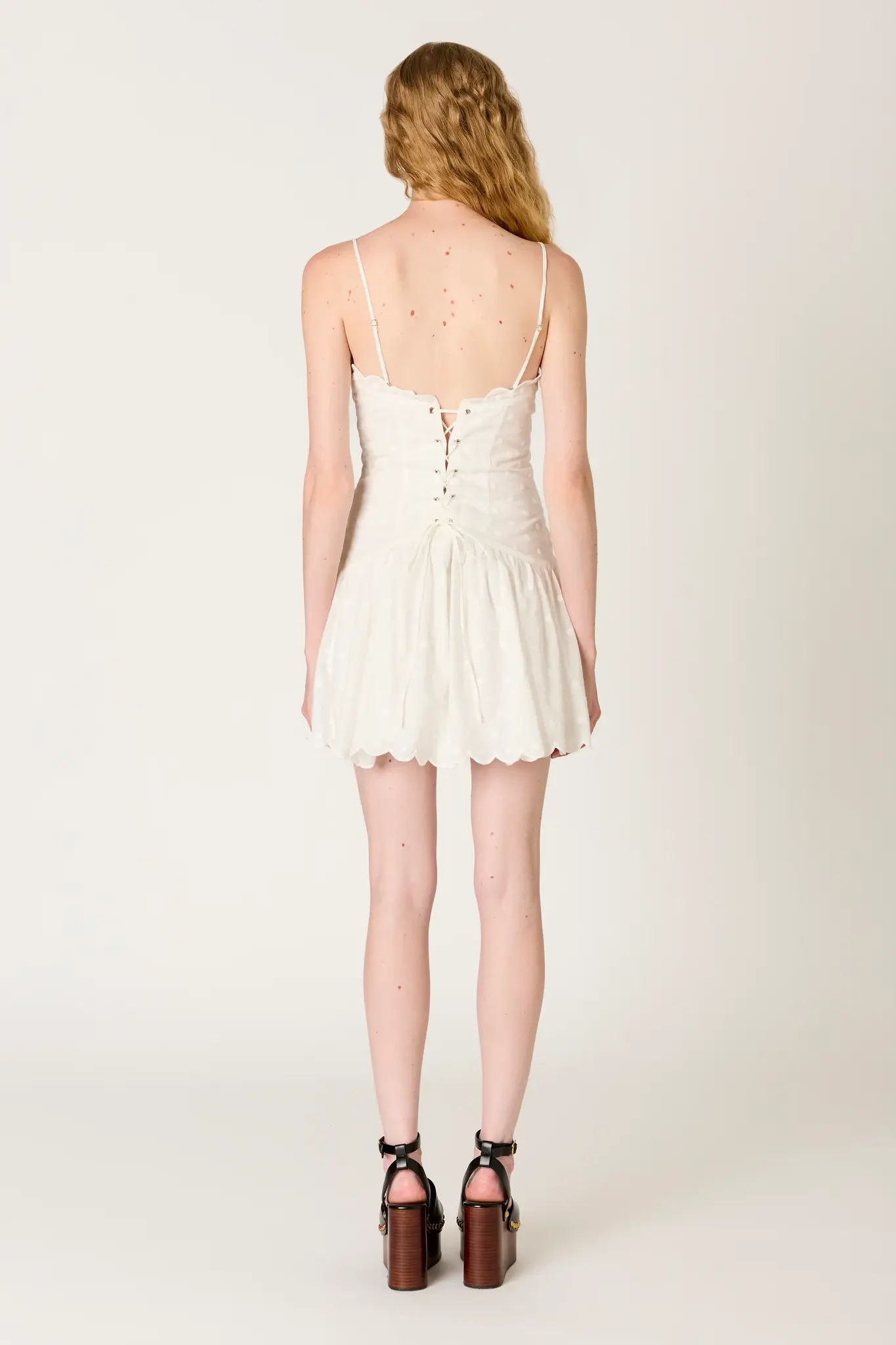 Structured and sweet with a fitted bodice and flared mini skirt. A scalloped neckline, adjustable straps, and tonal dot texture add dimension, while the lace-up back creates a customizable fit. Finished with a hidden zipper for an easy, polished look.