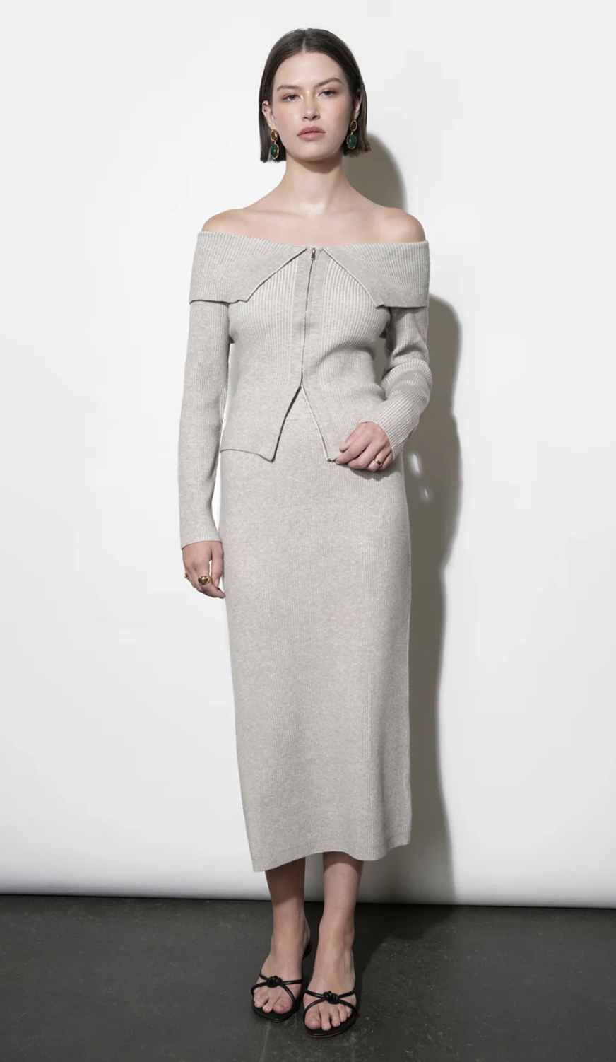 The Gabrielle Skirt is designed to elongate and flatter with a modern midi-length hem. The ribbed knit offers a flexible, body-skimming fit that moves with you. Pair it with the matching Hazel Top for a chic, coordinated look.