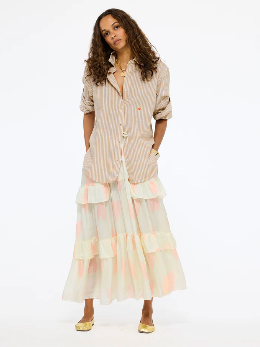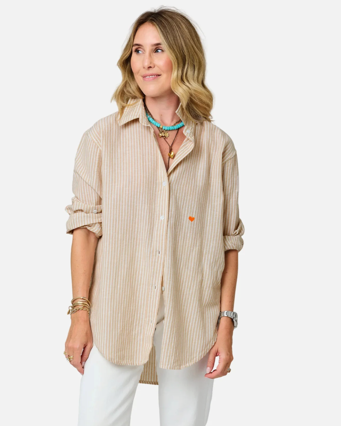 Yarn dyed stripe, embroidered heart at wearers left chest in contrast color, button in contrast color at wearer's left chest for crossover closure, 'Love 100%" on back