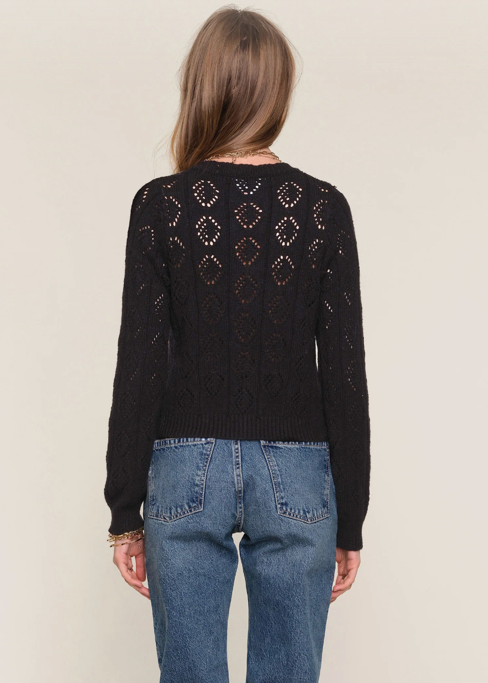 The Joelle Sweater is a feminine, slim fit cardigan. It features a pretty, pointelle stitch throughout and self ties at the front.