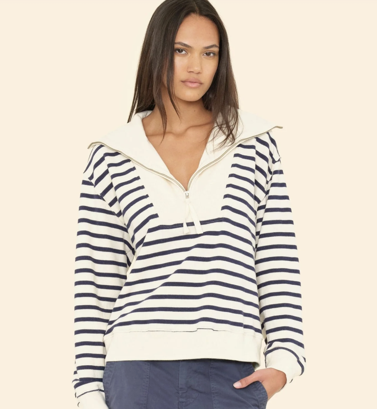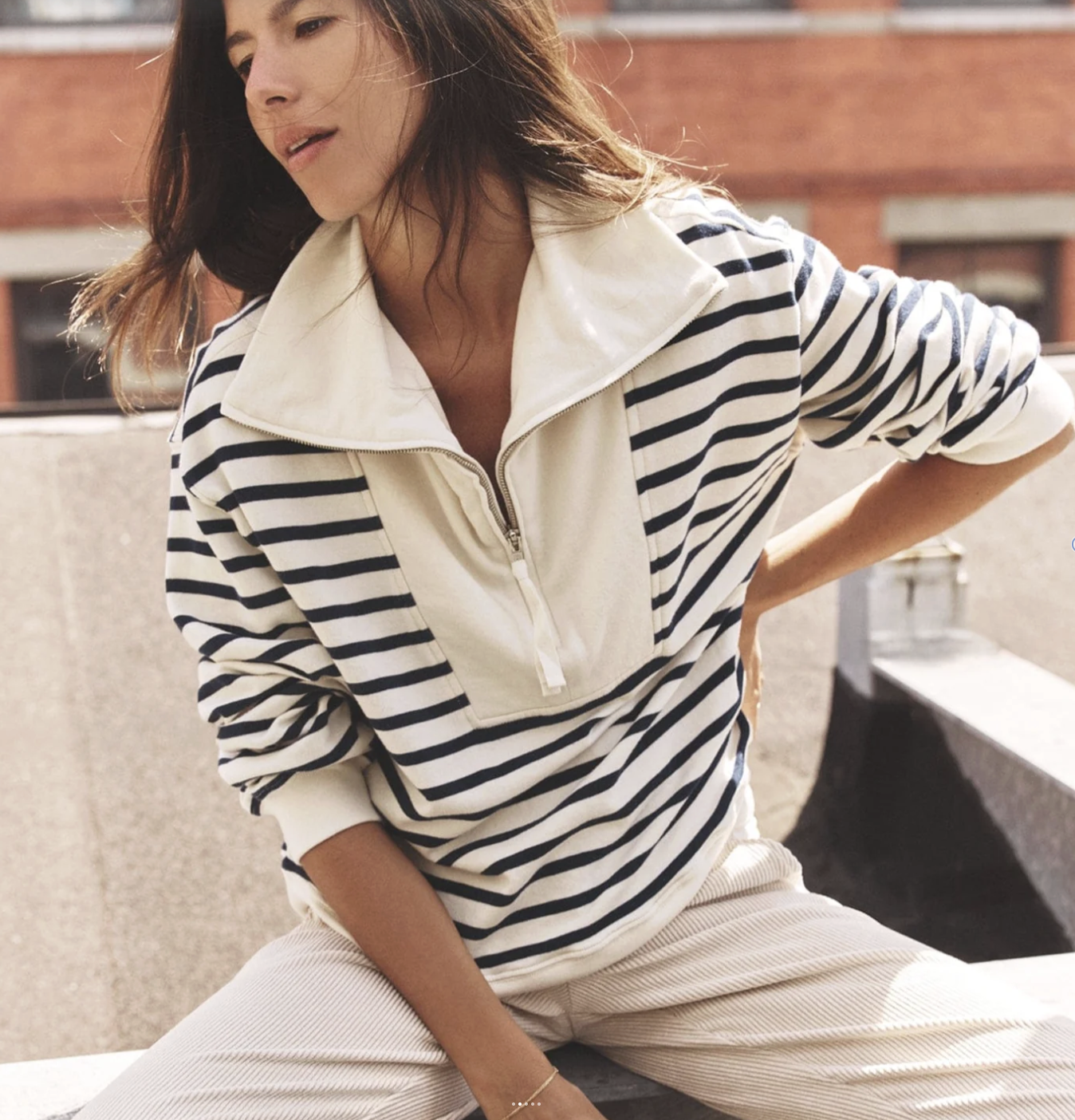 Show your Stripes. Kat is updated this season in our striped cotton French terry. Kat is a half-zip pullover sweatshirt that features a contrast collar funnel neck, hem, and cuffs. Pair her with the Emmette pant for a cozy lounge set.