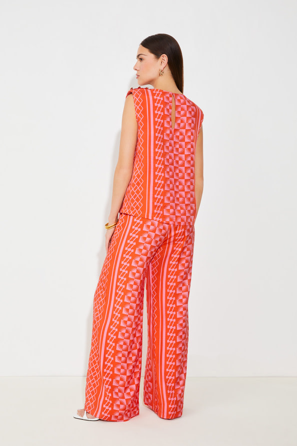 Printed sleeveless top with gold button detail. Wear her with the matching Jairo pant for a chic set.