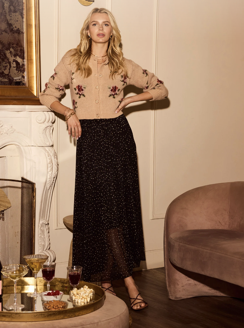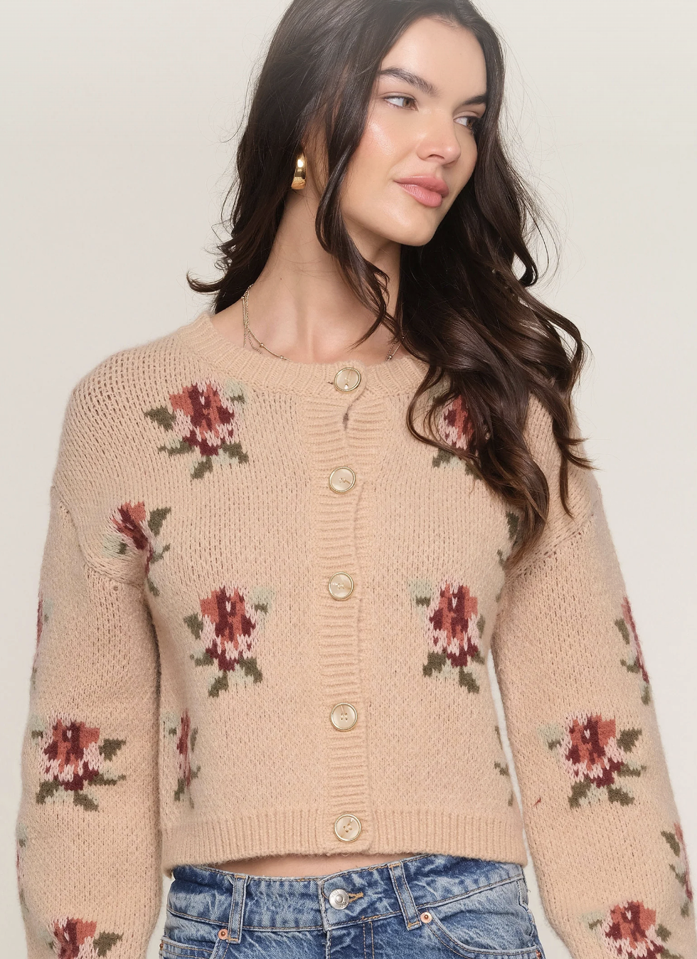 The Louis Cardi is one of our favorites this season. It has a super, cozy, relaxed fit and crew neck. It features pretty, novelty buttons and a rosette jacquard pattern throughout.