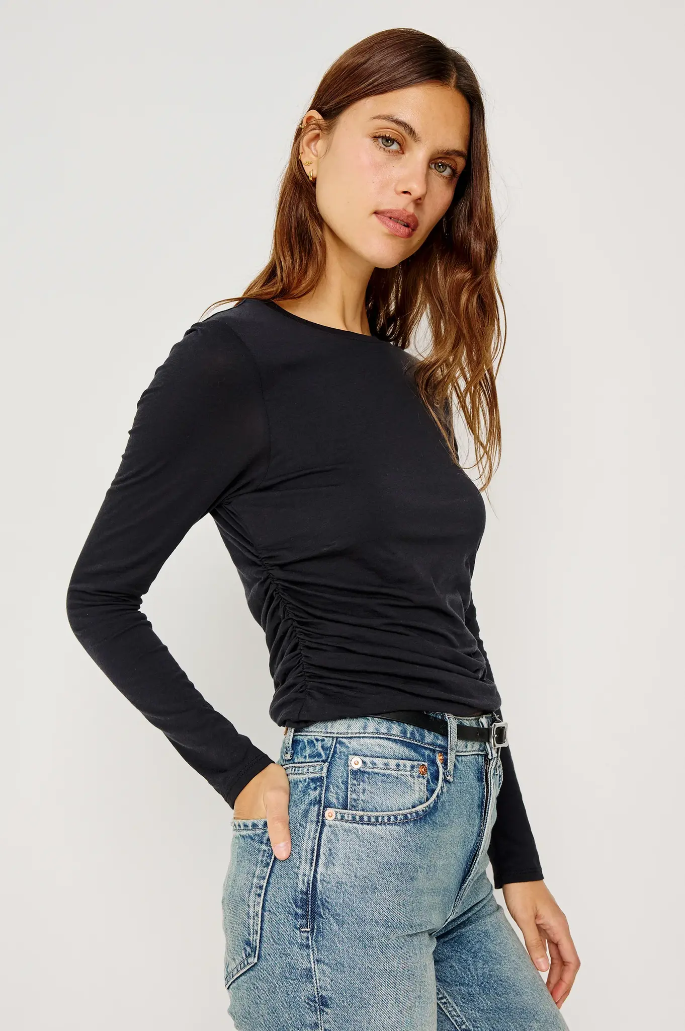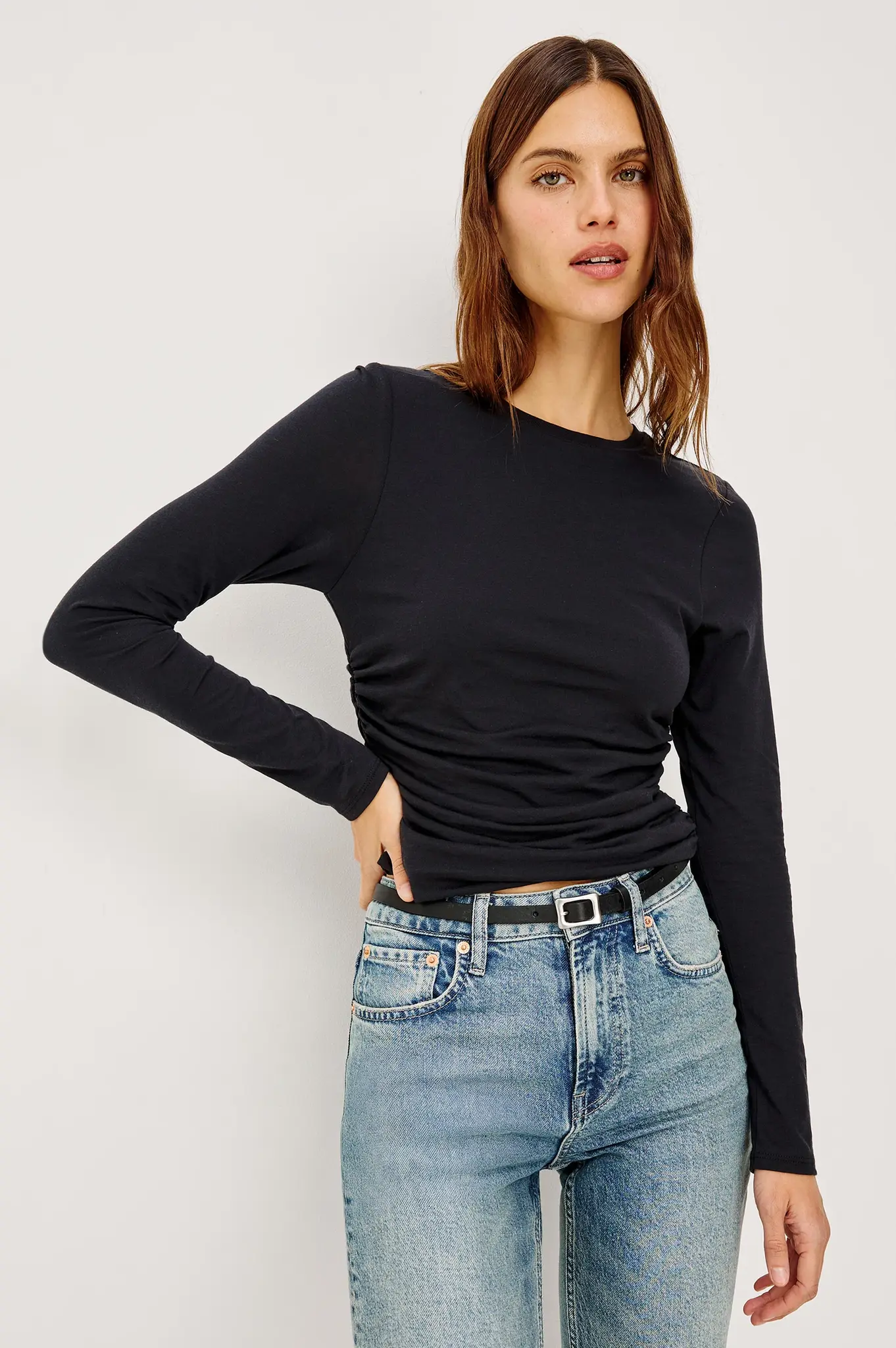 A wardrobe staple designed to flatter, the Melle features side shirring and a gently curved hem for subtle shaping. Made from buttery-soft organic cotton with a silky drape, the sleeves are relaxed at the shoulder and taper to fitted cuffs.