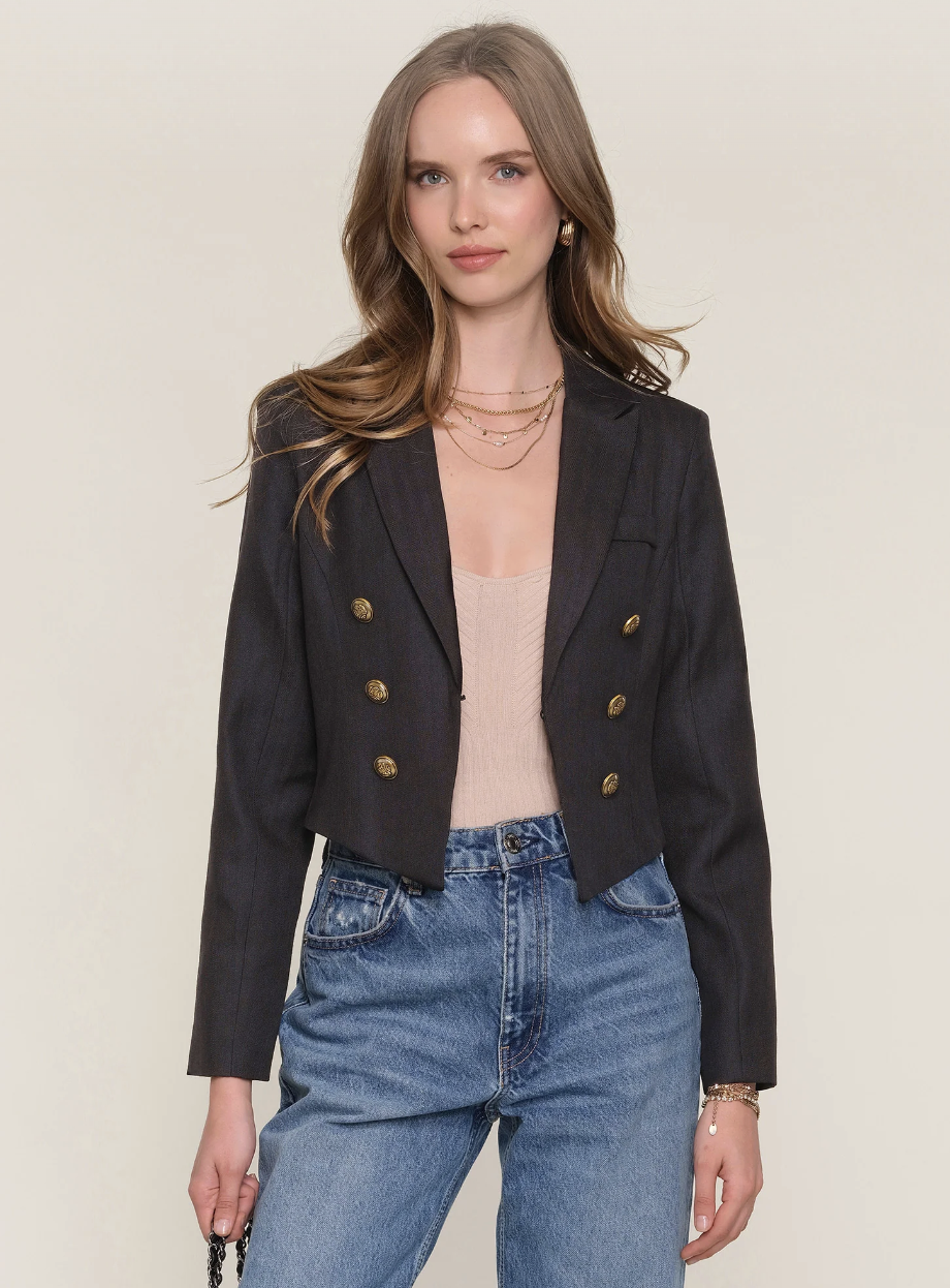 The Ophelia Blazer is a cropped, slim fit blazer. It features a stunning fit, novelty crest buttons and a hook & eye front closure.