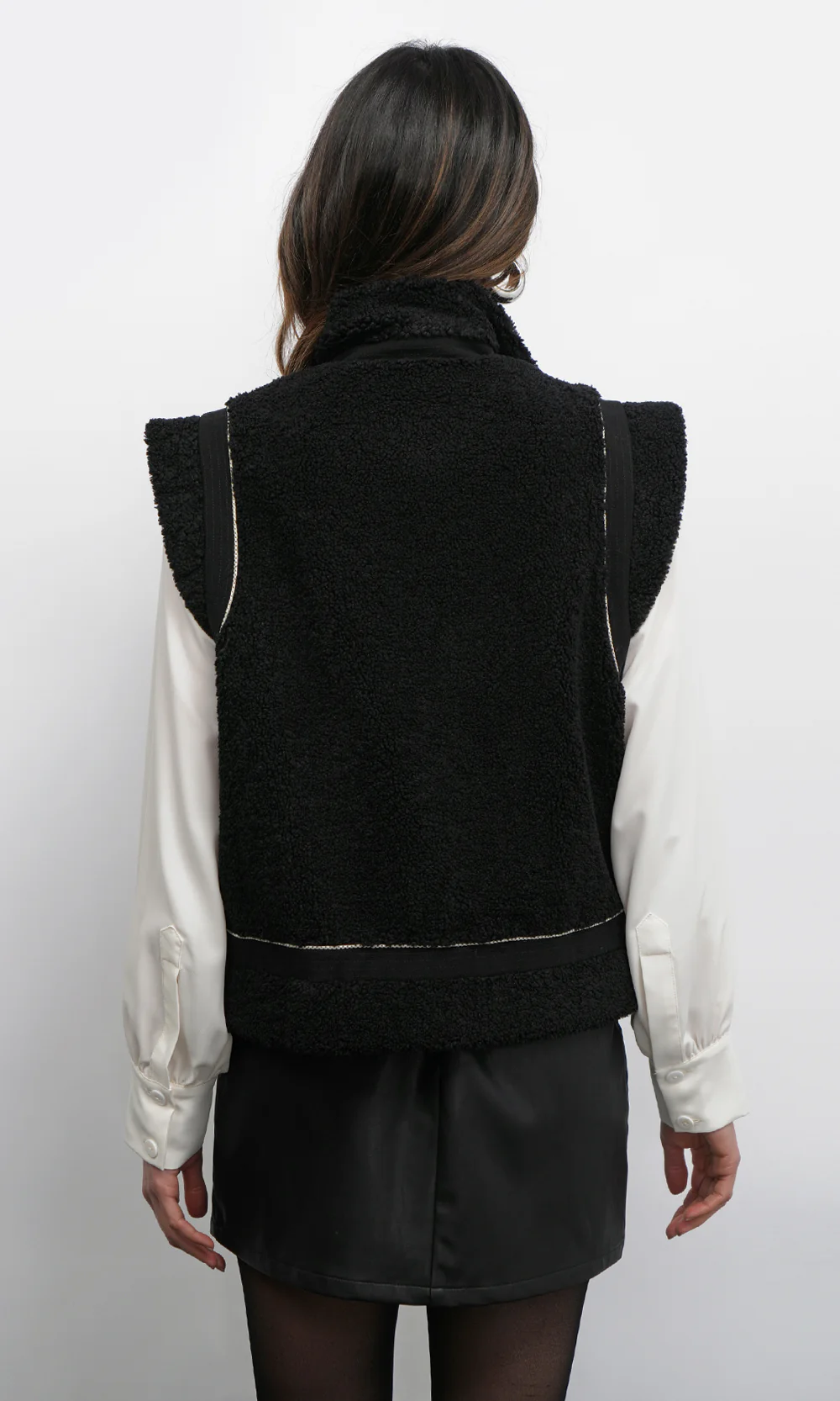 Crafted from a soft, faux shearling, offering a plush texture and comfortable feel. Featuring an open front with no closure, creating a relaxed, draped silhouette. The vest is lined with the same soft shearling, making it both stylish and warm.