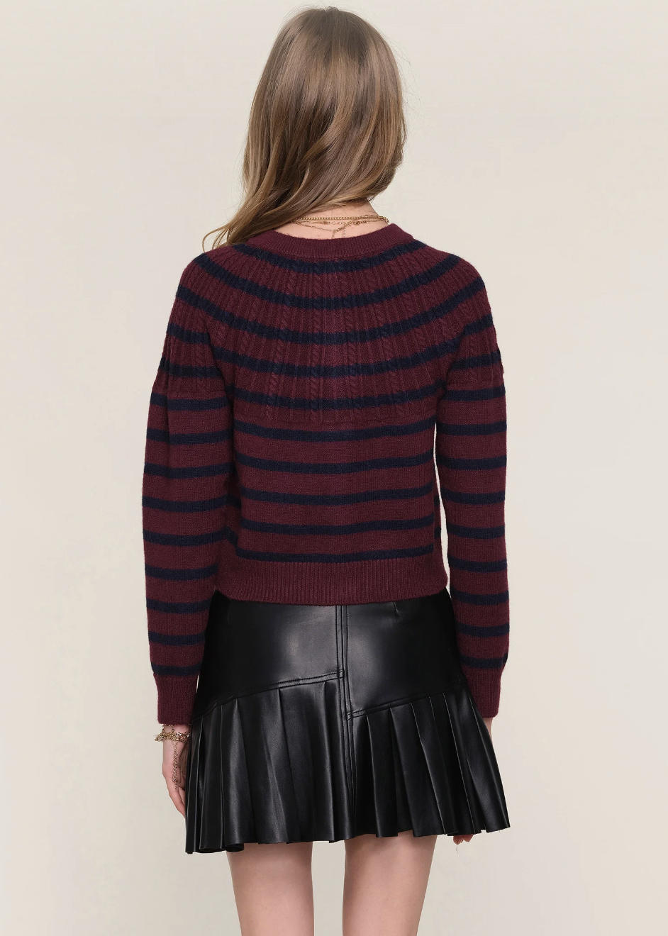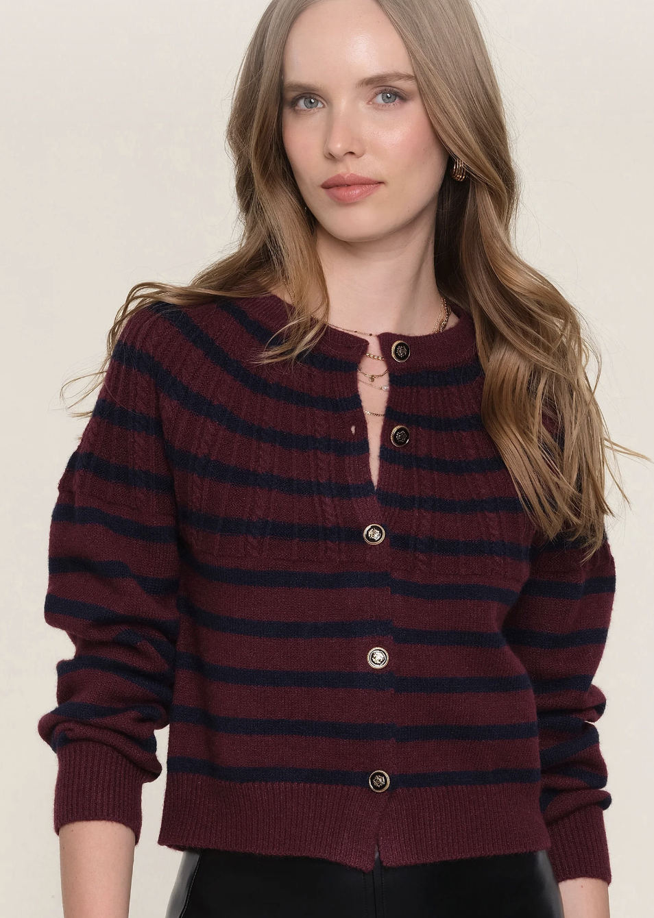 The Selene Cardigan is a crew neck, relaxed fit knit. It features a stripe layout with a cable stitch detail around neck. It also has cute, novelty buttons.