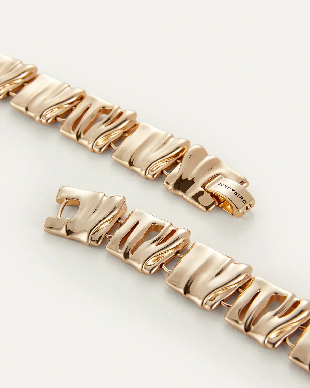 Organic square tiles mirror sand dunes shaped by natural winds. Each square is linked together forming a dynamic gold necklace full of texture.