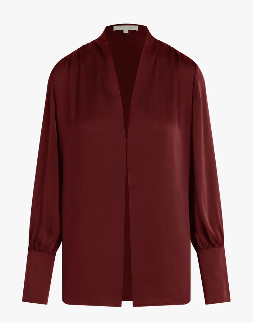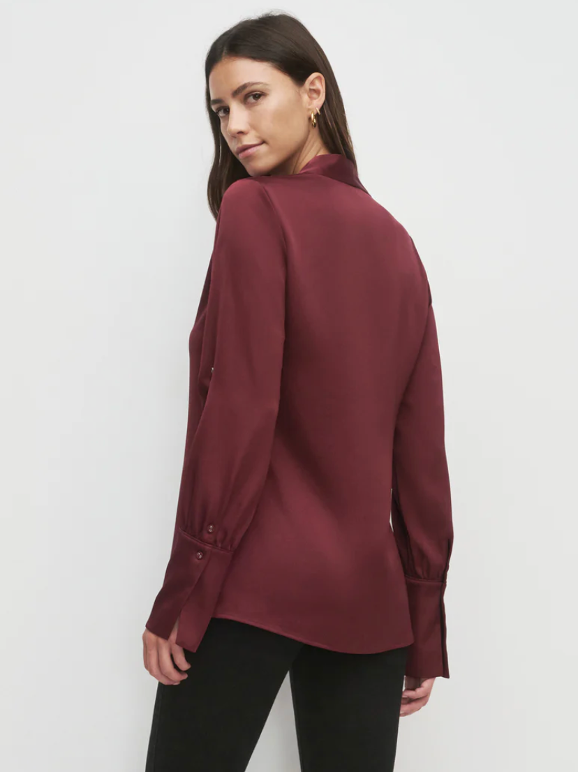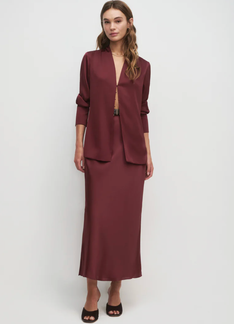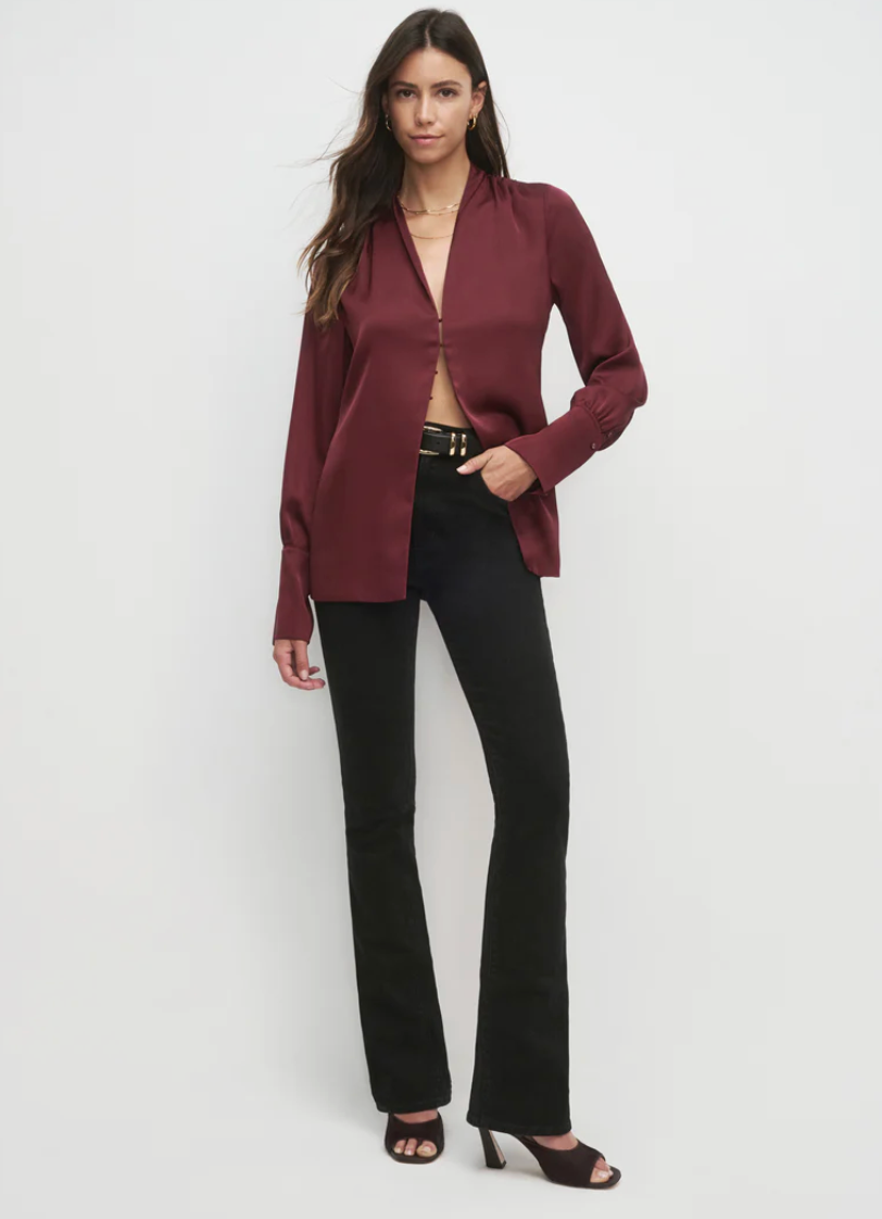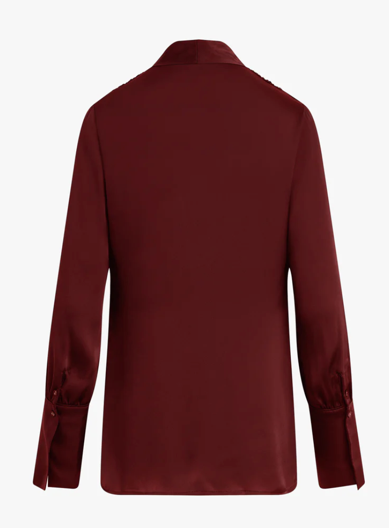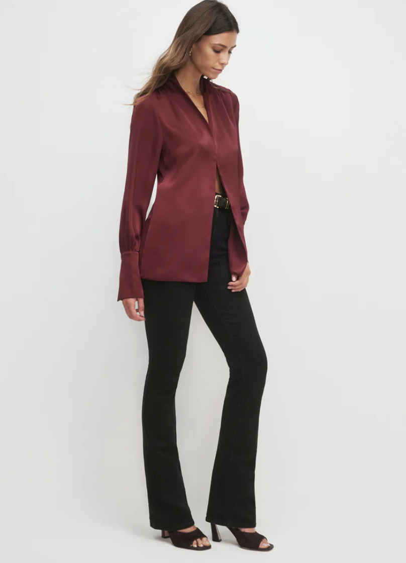 Add a silky satin layer with The Izzy Top. It's gathered at the shoulders for a soft drape and is finished with an exaggerated cuff detail and hook & eye closure.