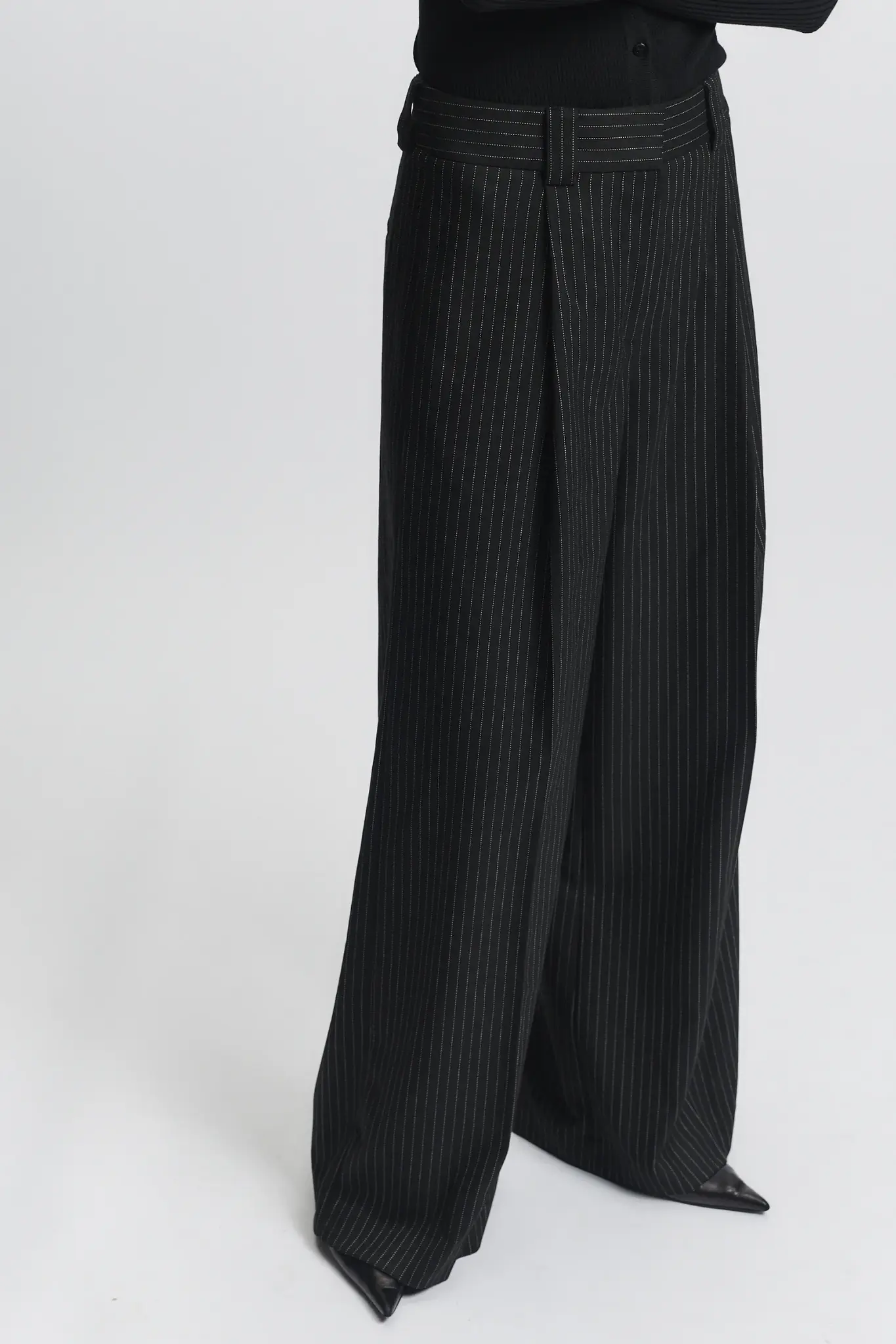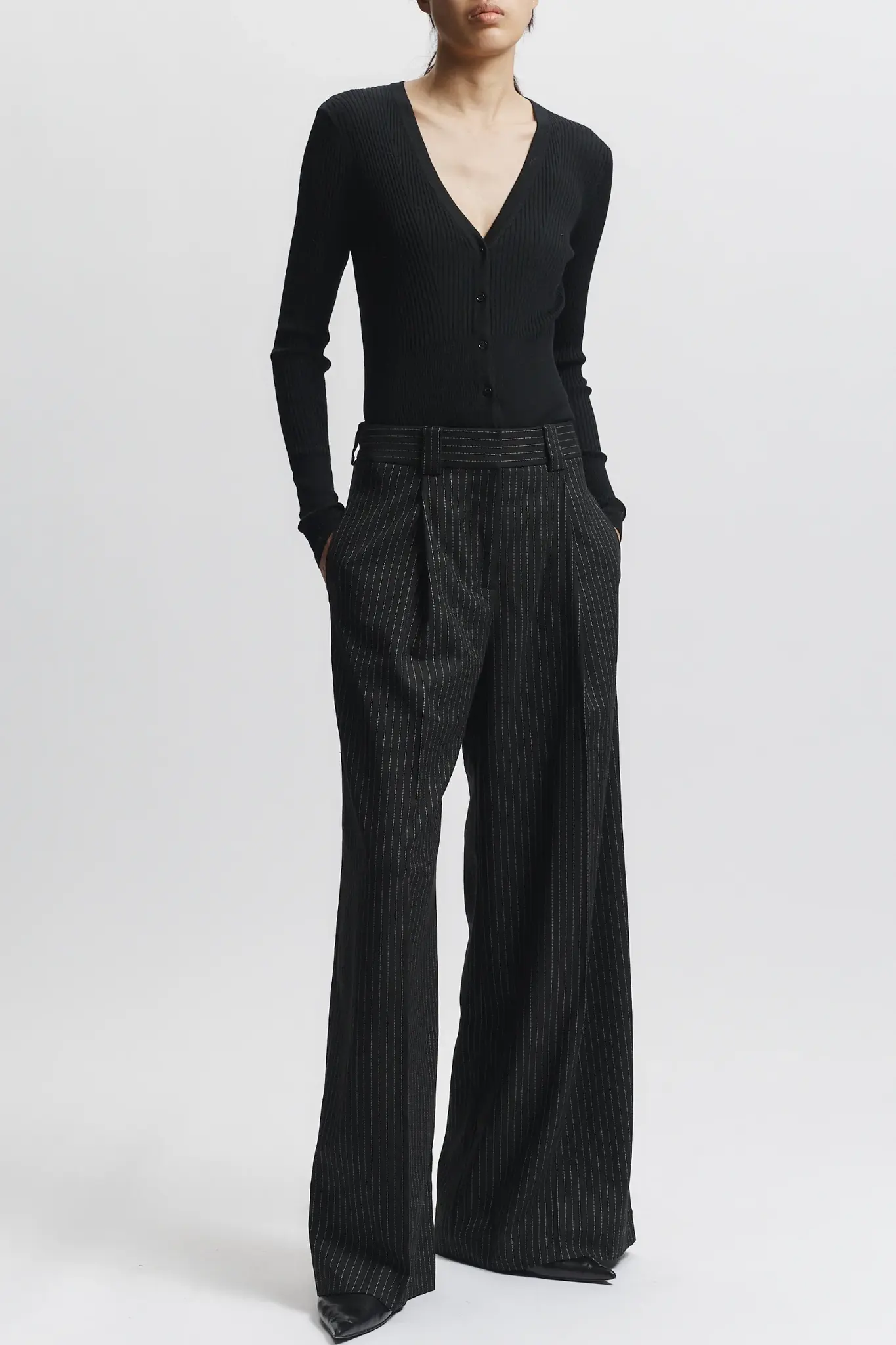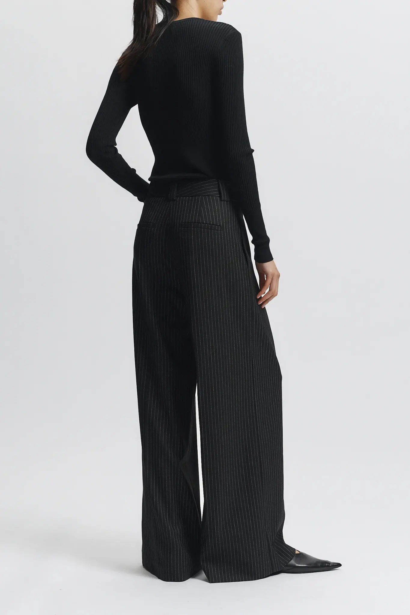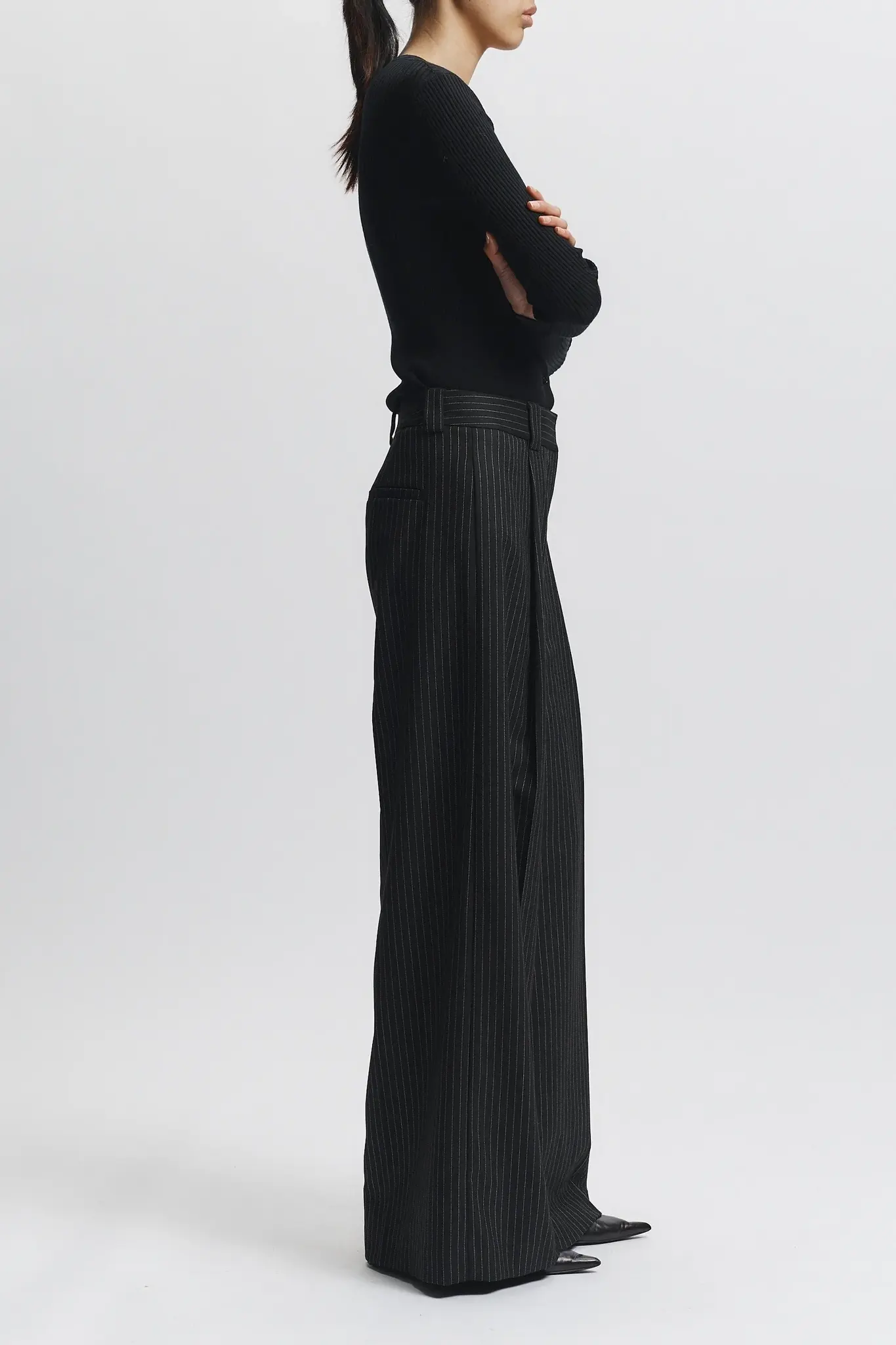 Elevate your wardrobe with the Tiffany Mid-Waisted Wideleg Trouser in charcoal pinstripe. Expertly tailored for a flattering mid-rise fit, these trousers feature a sophisticated wide-leg silhouette that balances comfort with a sharp, professional look.