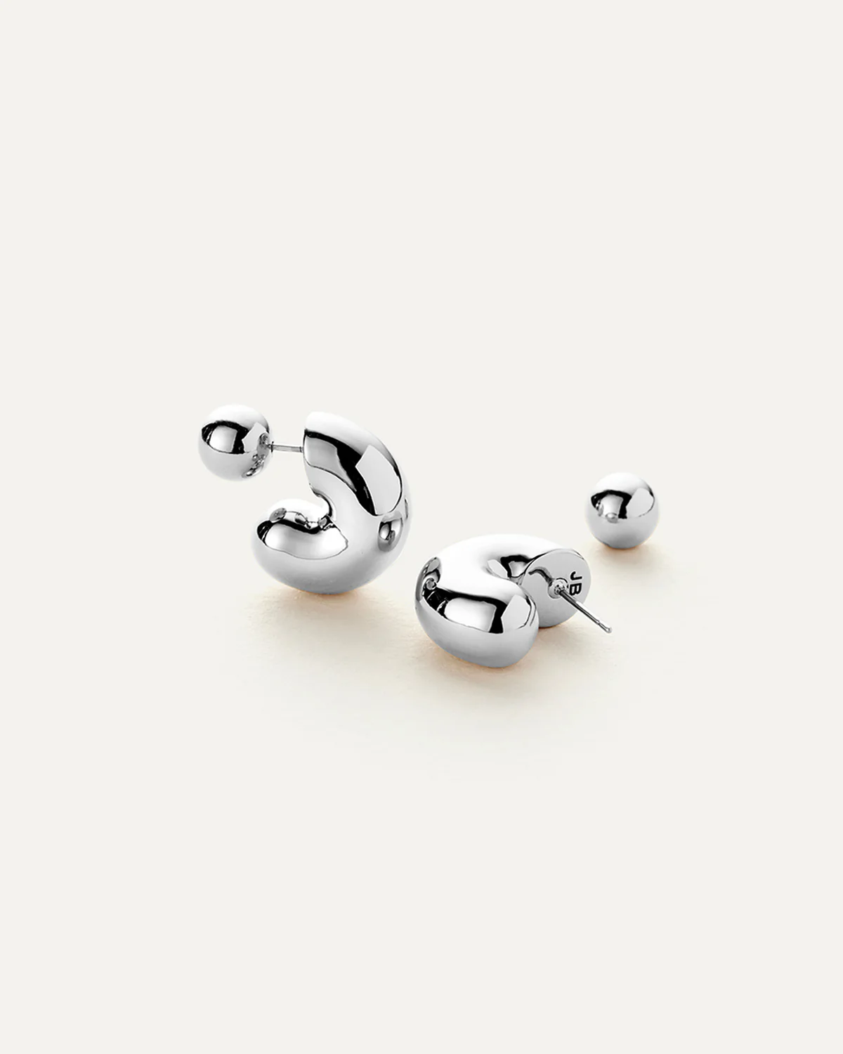 A tubular puffy hoop earrings with rounded ends and a custom JB ball backing. Finished in either 14k gold-dipped brass or high-polish silver.